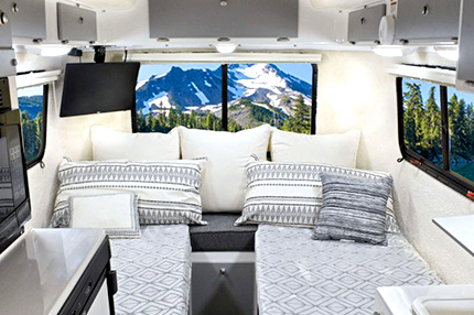 大きいリアウィンドウは換気・採光に優れているだけではなく雄大な自然の景色を眺めながら食事を楽しむことが出来ます。また、リアベッドはベッドをつなげて最大6人でも就寝が可能です。