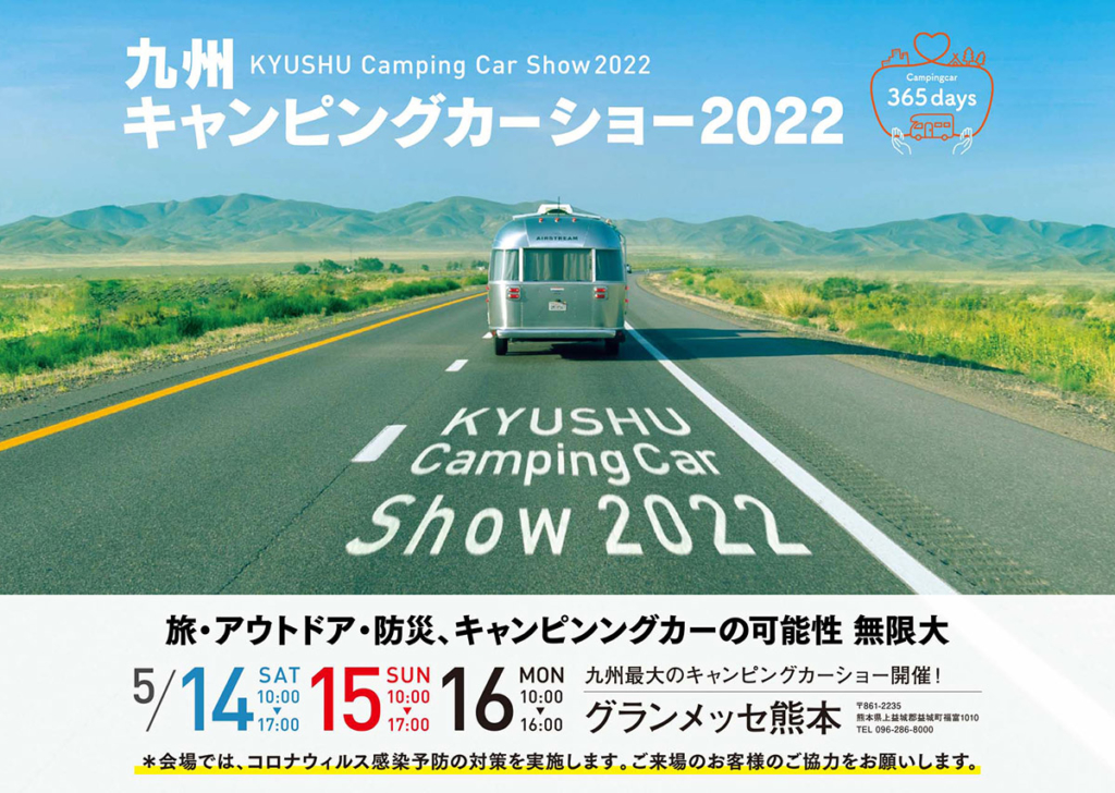 タイトル九州キャンピングカーショー2022 KYUSHU CAMPINGCAR SHOW2022会 場グランメッセ熊本〒861-2235 熊本県上益城郡益城町福富1010 tel.096-286-8000会 期2022年5月14日(土)・15(日)・16(月)(3日間)開場時間14日(土)10:00〜17:0015日(日)... -