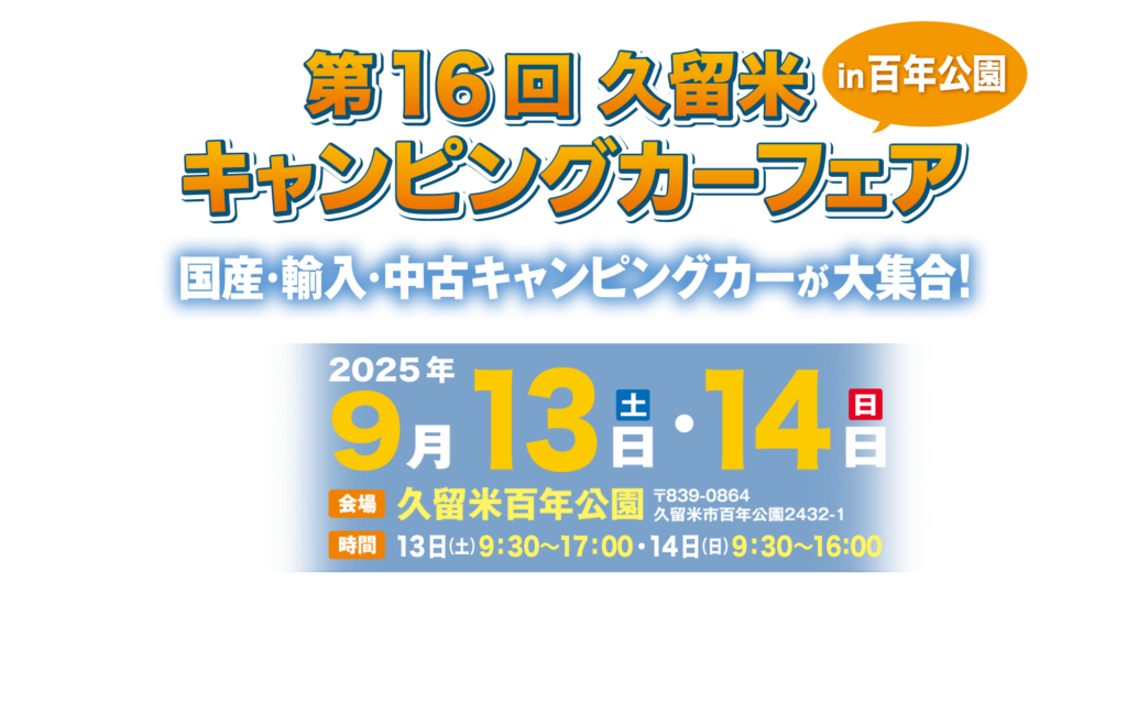 イベント名災害復興&九州応援イベント第16回 久留米キャンピングカーフェア in 百年公園会 期2025年 9月13日(土)・14日(日)の2日間開催時間9月13日(土) 9:30〜17:00・14日(日) 9:30〜16:00会 場久留米百年公園〒839-0864 福岡県久留米市百年公園2432-1... -