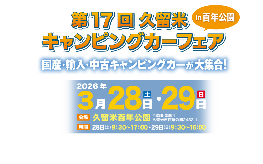 ント名災害復興&九州応援イベント第17回 久留米キャンピングカーフェア in 百年公園会 期2026年 3月28日(土)・29日(日)の2日間開催時間3月28日(土) 9:30〜17:00・29日(日) 9:30〜16:00会 場久留米百年公園〒839-0864 福岡県久留米市百年公園2432-1料 ... -